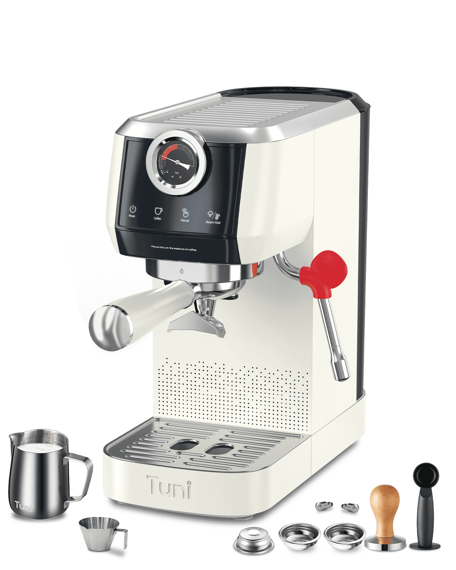 - [Touch Control & Visible Pressure Gauge] - The Tuni espresso machine features an intuitive touch control panel that makes it easy to navigate and customize your brewing settings. The built-in visible pressure gauge allows you to monitor the extraction process in real-time, ensuring precise pressure for a perfectly balanced espresso shot. This combination of modern touch controls and a traditional pressure gauge gives you full control over your espresso, making it simple to achieve barista-quality results at home.