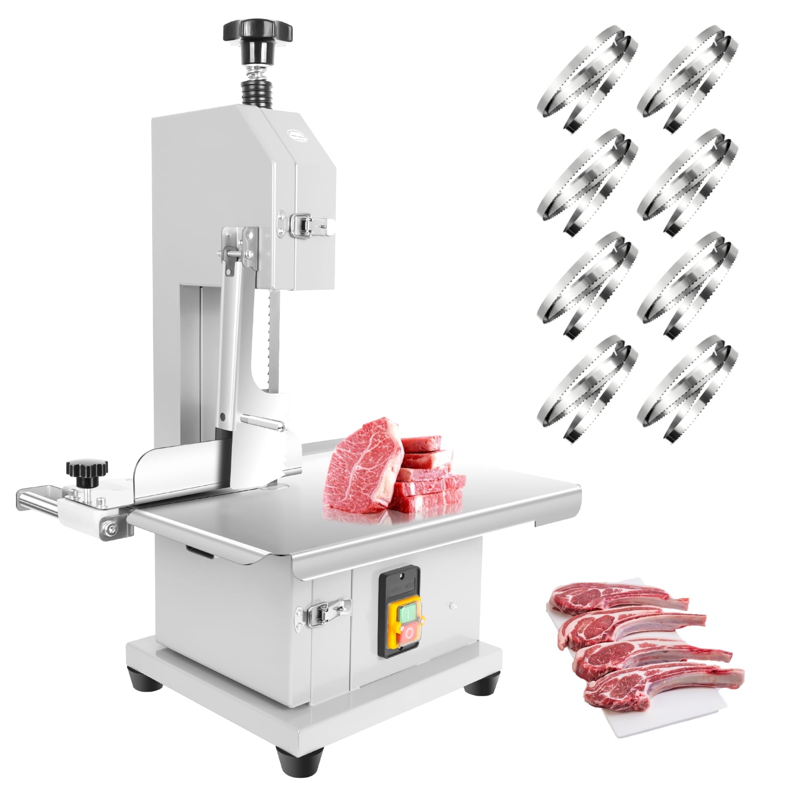 - 【Versatile Commercial Application with Imported Carbon Steel Saw Blades】 Engineered for heavy-duty use, this bandsaw efficiently processes various meats and bones (ribs, venison, beef/lamb bones, poultry, frozen fish). Ideal for restaurants, butcher shops, supermarkets, meat processing plants, and seafood facilities. The package includes the saw unit and 8 imported carbon steel replacement blades, which are removable/replaceable via the top knob. Loosen the blade knob after each use to extend its lifespan.