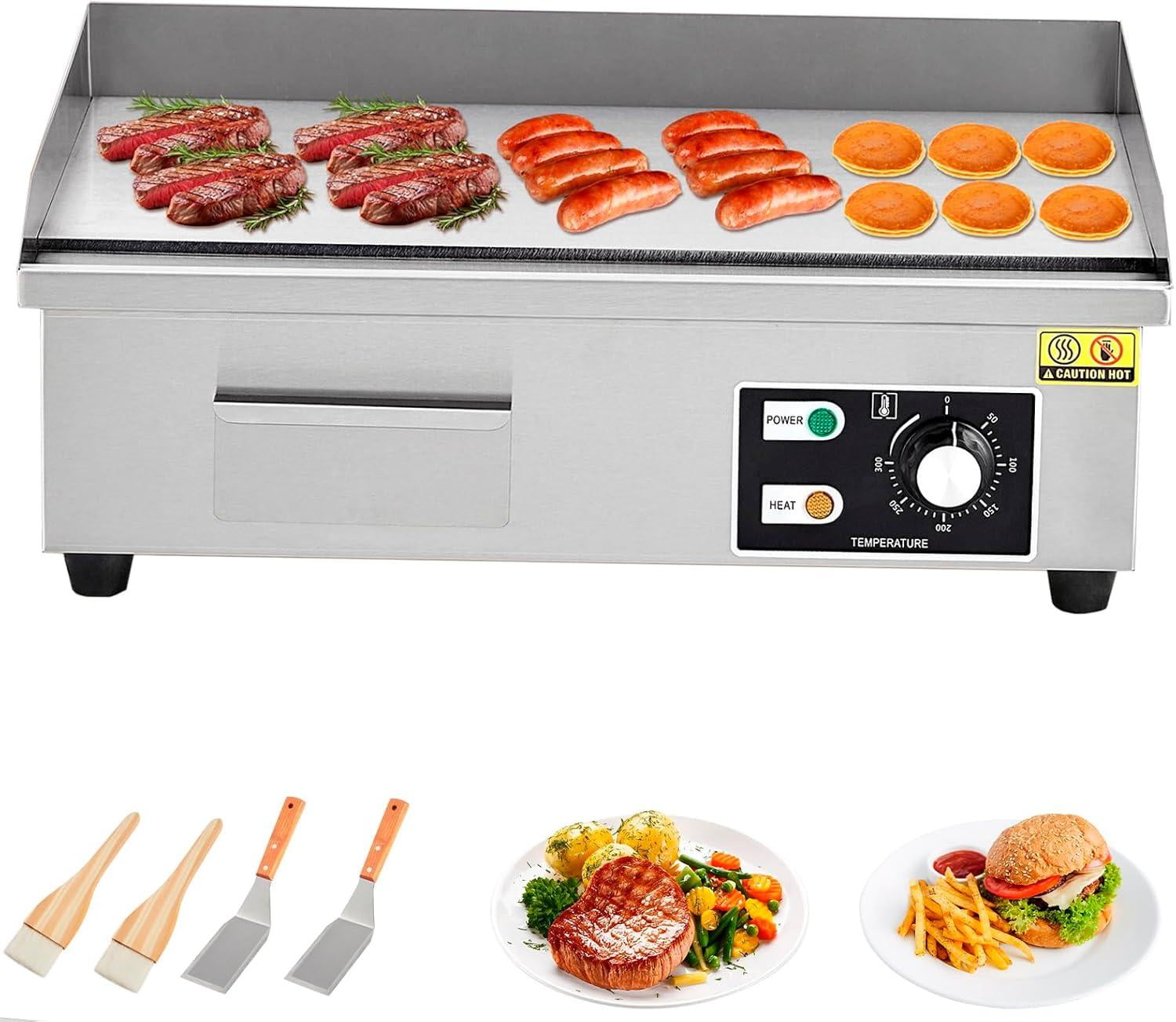 Key Features:Stainless Steel Construction: Built to withstand the demands of a busy kitchen, the high-quality stainless steel finish not only offers durability but also provides a sleek, professional look that enhances any countertop.Spacious Cooking Surface: The expansive flat top design provides ample cooking space, allowing you to prepare multiple dishes simultaneously. Perfect for busy restaurants or family gatherings, you can grill, sauté, and sear your favorite foods with ease.Precision Temperature Control: With an adjustable temperature range from 122°F to 572°F, you have full control over your cooking. Whether you’re searing meat, sautéing vegetables, or making pancakes, achieve perfect results every time.Included Accessories: This electric griddle comes complete with a shovel and brush, ensuring you have the right tools at your fingertips for flipping, serving, and keeping your cooking surface clean.Easy to Clean: Designed for efficiency, the smooth, non-stick cooking surface minimizes cleanup time. Simply wipe down the surface after each use, and the removable grease tray makes disposing of excess fats hassle-free.Versatile Cooking Options: Perfect for diverse cooking styles, this griddle allows you to prepare everything from teppanyaki-style dishes to classic grilled sandwiches. Use it for breakfast, lunch, dinner, and everything in between!Why Choose Our Commercial Electric Griddle?Our Commercial Electric Griddle is the ultimate cooking companion for anyone who appreciates quality and efficiency in the kitchen. Whether you're running a bustling restaurant or simply love to entertain at home, this griddle offers the versatility and performance you need to impress your guests and elevate your meals.