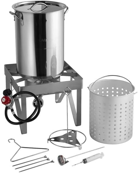 - Convenient kit: This complete seafood boil kit includes a heavy-duty steel base, a 55,000 BTU cast iron burner (propane only), a 30 qt. stainless steel stockpot and boiling basket, and a variety of additional accessories for added versatility.