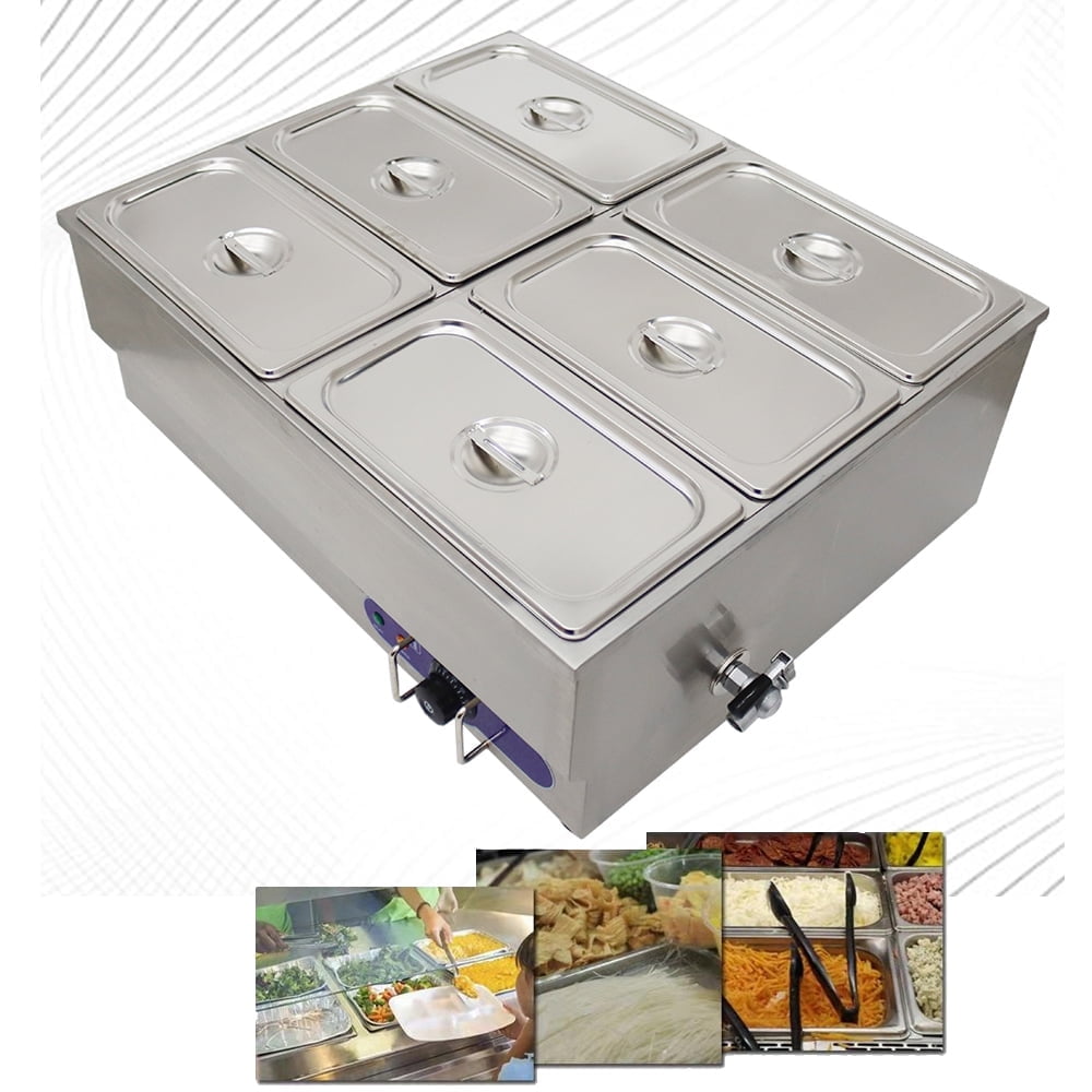 6-Pot Food Warmer Double Row Commercial Canteen Buffet Steam Heater Food Container