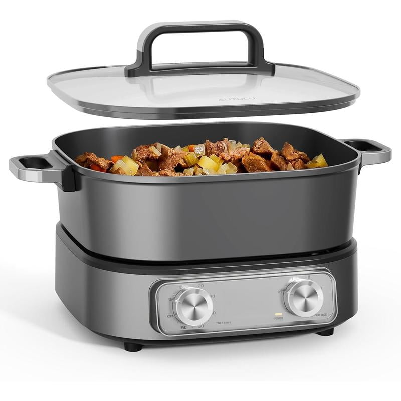 【Dual Knobs For Time and Temperature Control】 The left timer knob precisely controls cooking time and pauses when time is up. The right heat knob adjusts the heat level for different cooking needs. (The Electric Pot serves as a versatile kitchen appliance that can be as a hot pot, electric soup pot, Electric Skillets, frying pan, soup pot, and more.) 【Non-stick PFOA-Free Ceramic-Coated Pot】 This electric hot pot features a Non-stick PFOA-Free Ceramic-Coated on both inner and outer layers, offering excellent release and easy cleaning. To maintain the coating's durability, please avoid using metal utensils. 【Multi-Power Adjustment with Easy Controls】 High-Power Electric Hot Pot serves as a versatile hot pot with three adjustable power levels (400W, 1200W, and 1600W) for warming, stir-frying, and steaming. The timer knob can be set up to 60 minutes, or turned to “Keep” for continuous heating, allowing flexible cooking options to suit your needs. 【Practical and Stylish】 This PFOA-free Multi-Cooker features a well-designed 3.7-inch depth, effectively preventing overflow and leakage. This allows you to cook a variety of dishes without worrying about messes. Its sleek design not only enhances kitchen aesthetics but also makes it a stylish centerpiece for gatherings, ensuring a hassle-free cooking experience. 【User-Friendly Design】 This non-stick electric cooker features a pair of anti-scalding handles for safe and convenient operation. The bottom is equipped with eight non-slip clips and ventilation holes, ensuring stability and effective heat dissipation. The tempered glass lid allows you to easily the cooking process, preventing loss and guaranteeing delicious results. 【SEAR and SAUTÉ DIRECTLY IN THE POT】 Using the bottom heating , you are able to sear proteins and sauté vegetables right in the cooking pot—no need to transfer to the stovetop. Do not place the pot in the oven to avoid melting the handles. 【A thoughtful idea】The N12NA Electric Cooker is an excellent choice for friends. With its multifunctional cooking capabilities, refined design, and sophisticated color palette, it stands out as a . These qualities particularly resonate with teenagers, making it both a practical and stylish option.