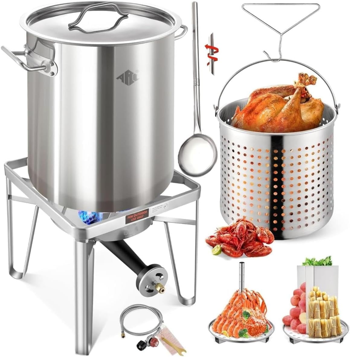 - MULTIFUNCTIONAL STOCK-POT SET: No matter from boiling or frying turkey, home brewing, or steam tamale. With this pot, you can enjoy this pot all year long. Well constructed and sturdy design, it won't be deformed easily when you use it, more durable and secure to use outdoors.