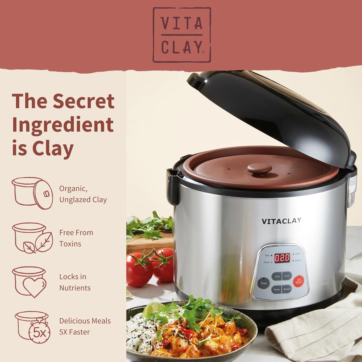8-Cup (4 qt) 4-in-1 Stainless Steel Rice and Slow Cooker with Unglazed Clay Pot, Lead-Toxin Free, Multi-Function Cooker with Timer, Warm Mode, LCD Display, Measuring Cup & Premium Recipe Book