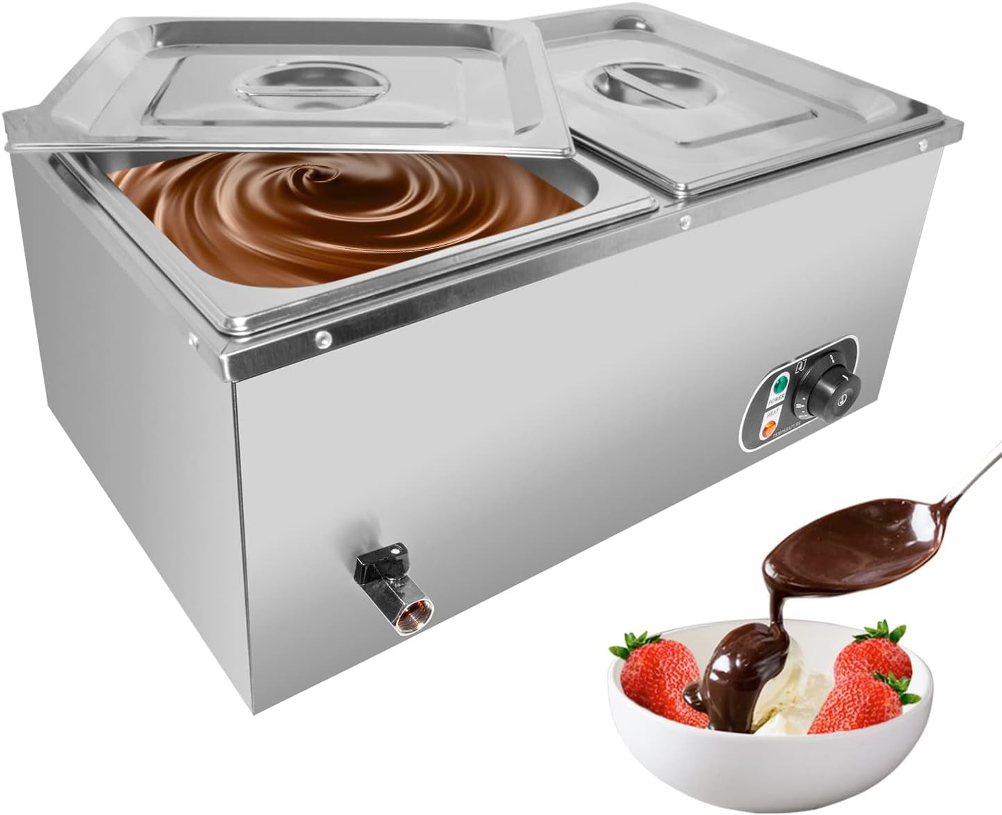 - ✪ BIG VOLUMES: This Bain Marie Food Warmer is meant for home and business use. The power consumption is 1500W. The heat level is controlled manually with a temperature control knob located on the front panel