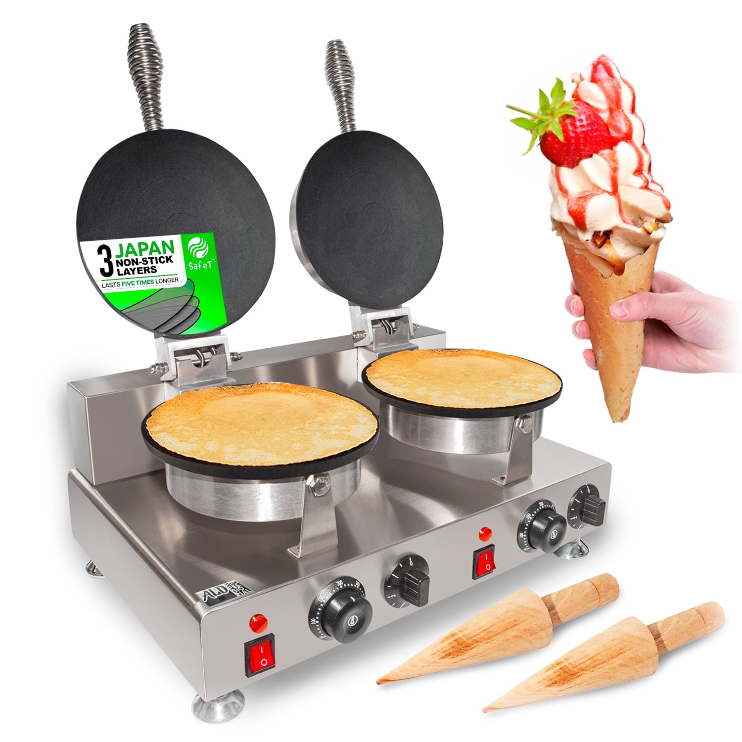 - ✪ COMMERCIAL USE: This electric 2-head waffle cone maker is designed to cook two big round waffles that can be rolled into ice cream waffle cones. A plastic cone comes with the appliance. The machine is equipped with a manual temperature control system and a timer knob. The power is 2.4kW. It takes a few minutes to cook two crunchy nutritive waffles with an 8-inch diameter. Perfect for both home and business use.