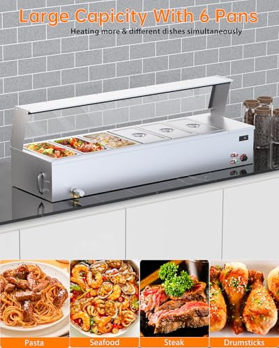 Ataucjin 48 QT Steam Table 6x8QT Electric Commercial Food Warmer 6-Pans with Acrylic Shield Stainless Steel Bain Marie Countertop with Overheating Protection for Restaurants Buffets Party 1500W, 110V