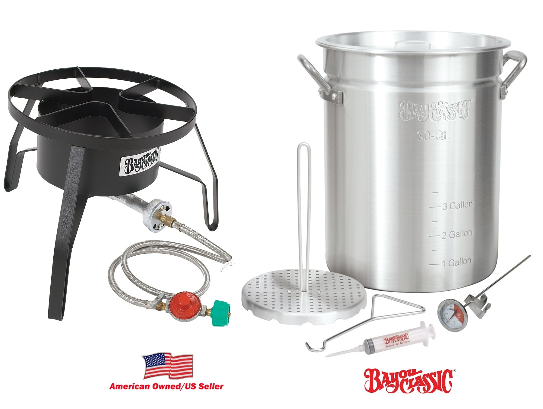 The Bayou Classic Outdoor Cooking System is the essential item needed when entertaining outdoors. The 30-Quart Stockpot was specifically designed for frying whole turkeys. The tall, narrow patented design requires less cooking oil than a standard stockpot. The perforated raised poultry rack allows the cooking oil to circulate evenly when frying, preventing the bottom from scorching. The grab hook provides a way to safely insert and remove poultry from hot cooking oil. The 12" Stainless Steel Deep Fry Thermometer is perfect for maintaining a constant temperature of cooking oil when frying.