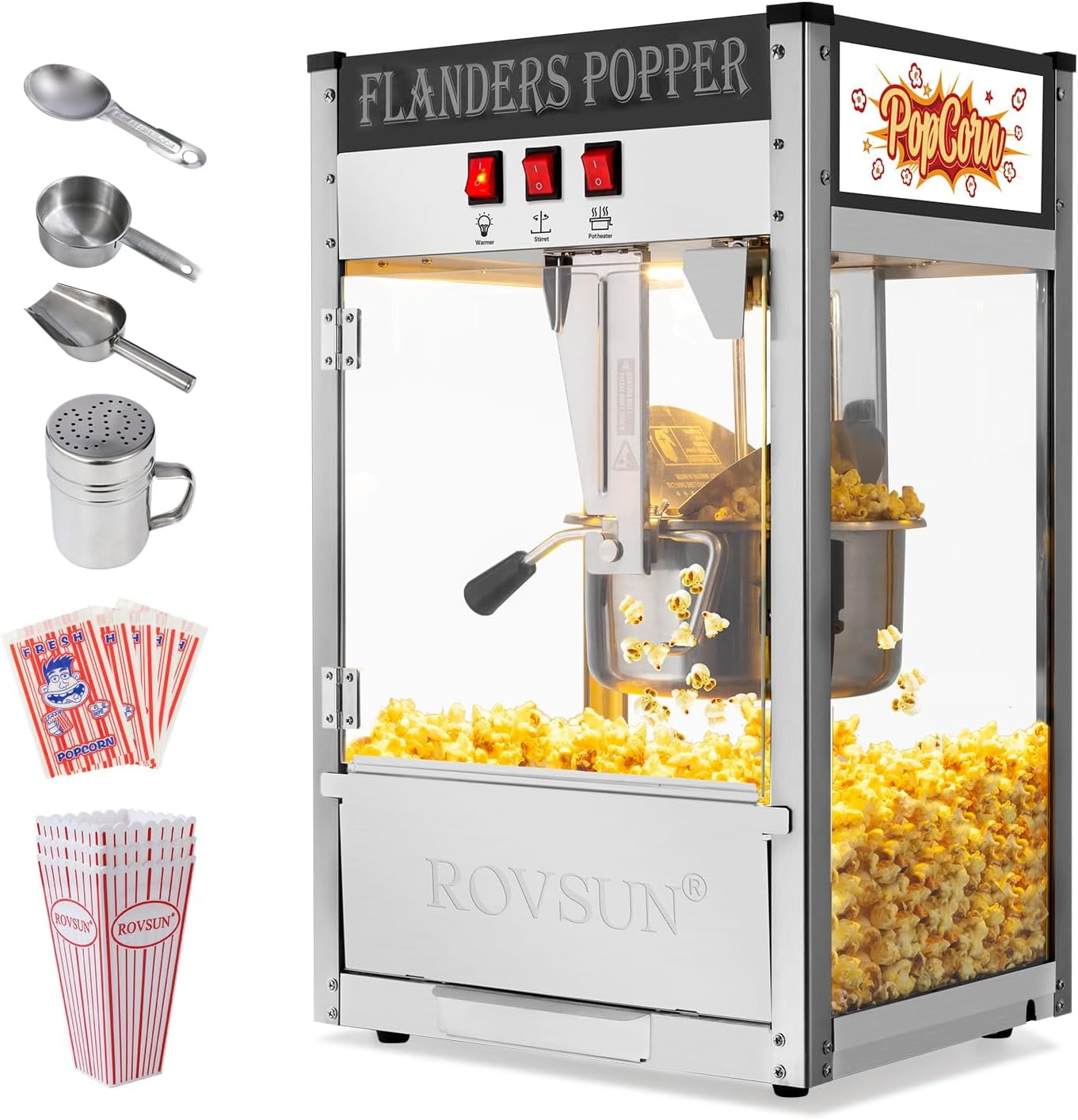 - 【Comes with Accessories】The commercial popcorn machine comes with 1 popcorn scoop, 1 oil measuring spoon, 1 corn measuring spoon, 3 popcorn cups and 1 power shaker