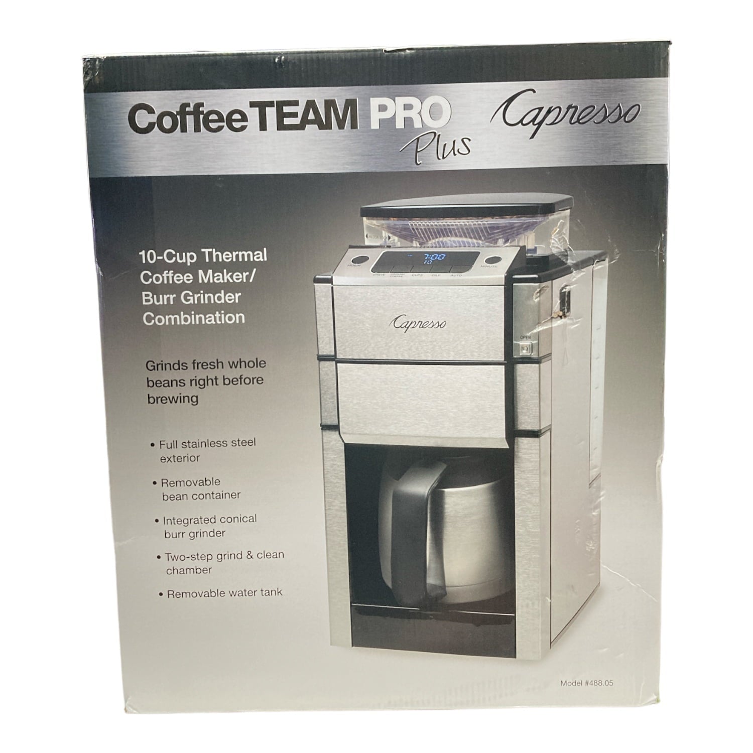 - Freshly grinds whole coffee beans directly into the filter then automatically brews up to 10 cups of coffee - 10-cup stainless steel thermal carafe with ergonomic handle has brew- through lid and drip-free pouring spout - Permanent GoldTone Filter is easy to use and clean - 24-hour programmable clock/timer with easy-to-read LCD display - Fully removable water tank for easy filling - Integrated, professional, solid steel conical burr grinder with removable upper burr - Slow burr grinding imparts minimal heat, preserving more aroma - Two-step grind & clean chamber automatically cleans the grinder after every cycle - Patent-pending dispenser improves flow of ground coffee into the filter - Special Oily coffee bean setting for slow feeding dark roasts - Improved bean container with low-friction, ribbed surface for easy feeding beans - Fully removable 7-ounce bean container is easy to unlock and lift, to change out beans or access burr for cleaning - Beans stay inside of container when removed, no spilt beans - Freshness seal bean container lid preserves coffee flavor - Three fineness settings for light to dark beans let you adjust the grinder to your preference (the darker/oilier the bean, the coarser the setting) - Use with or without the grinder, accommodating pre-ground coffee, flavored coffees or decaf - Charcoal water filter removes up top 82% of impurities - Drip stop for pouring a cup while brewing - Full stainless steel exterior - Automatic shut off - AM/PM Programmable Clock/Timer to grind and brew automatically