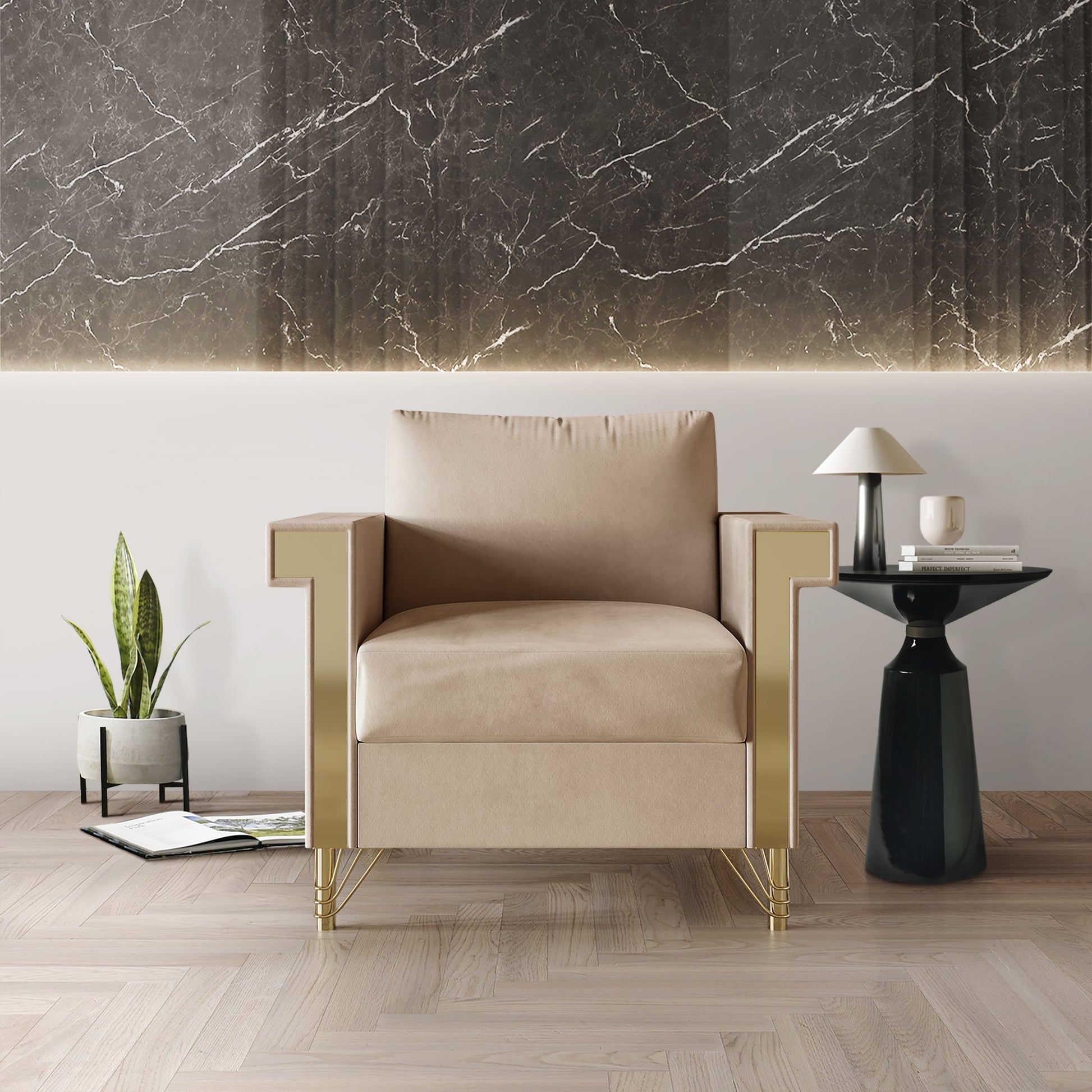Elevate your living space with our glamorous and luxurious upholstered armchair, making it an exquisite addition to your home. Crafted from 100% velvet polyester, this sumptuous upholstery is renowned for its softness and durability. The armchair is supported by sturdy gold metal legs and enhanced with acrylic gold plating at the front armrest area. Available in a versatile range of colors, including Black, Navy Blue, Silver Grey, Champagne, Caribbean Green, Fawn Grey, Midnight Blue, Beige, Dark Pink, and Dark Grey. The arm chair ships in one box, complete with assembly instructions and hardware, ensuring a straightforward setup. Note: Essential assembly components may be concealed within the furniture (e.g. beneath sofa cushions). Please check all compartments, including zipped areas, to locate all parts before assembly.
