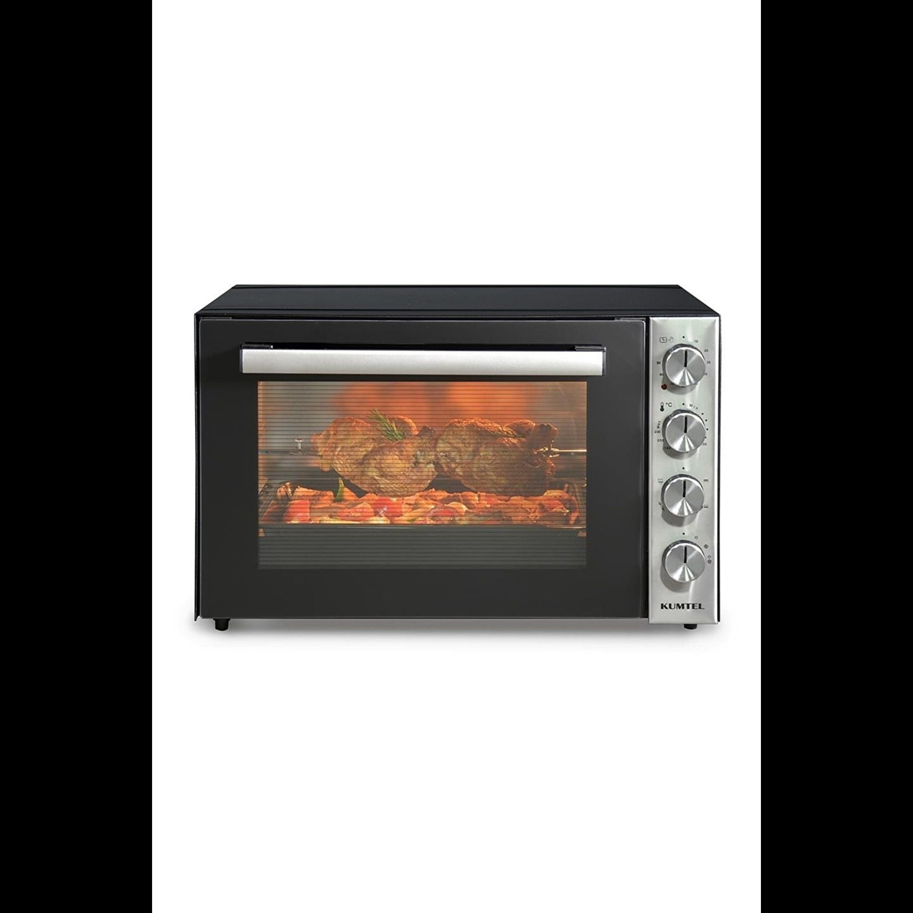 KUMTEL Chicken Rotisserie 70 LT. Midi Oven LX-9645 Inox panel, black body 70 liters large internal volume 5 cooking functions Turbo fan cooking feature Chicken rotisserie option Interior lighting lamp Time setting with buzzer warning Adjustable thermostat Double glass lid Oven power: 2500 W (Lower 1250 + Upper 1250 W) 1 cornered / 1 round enamel deep tray Cr-Ni grill Long-lasting stainless Cr-Ni resistance Product net dimensions: (W x B x H) (cm) 52 x 60 x 40