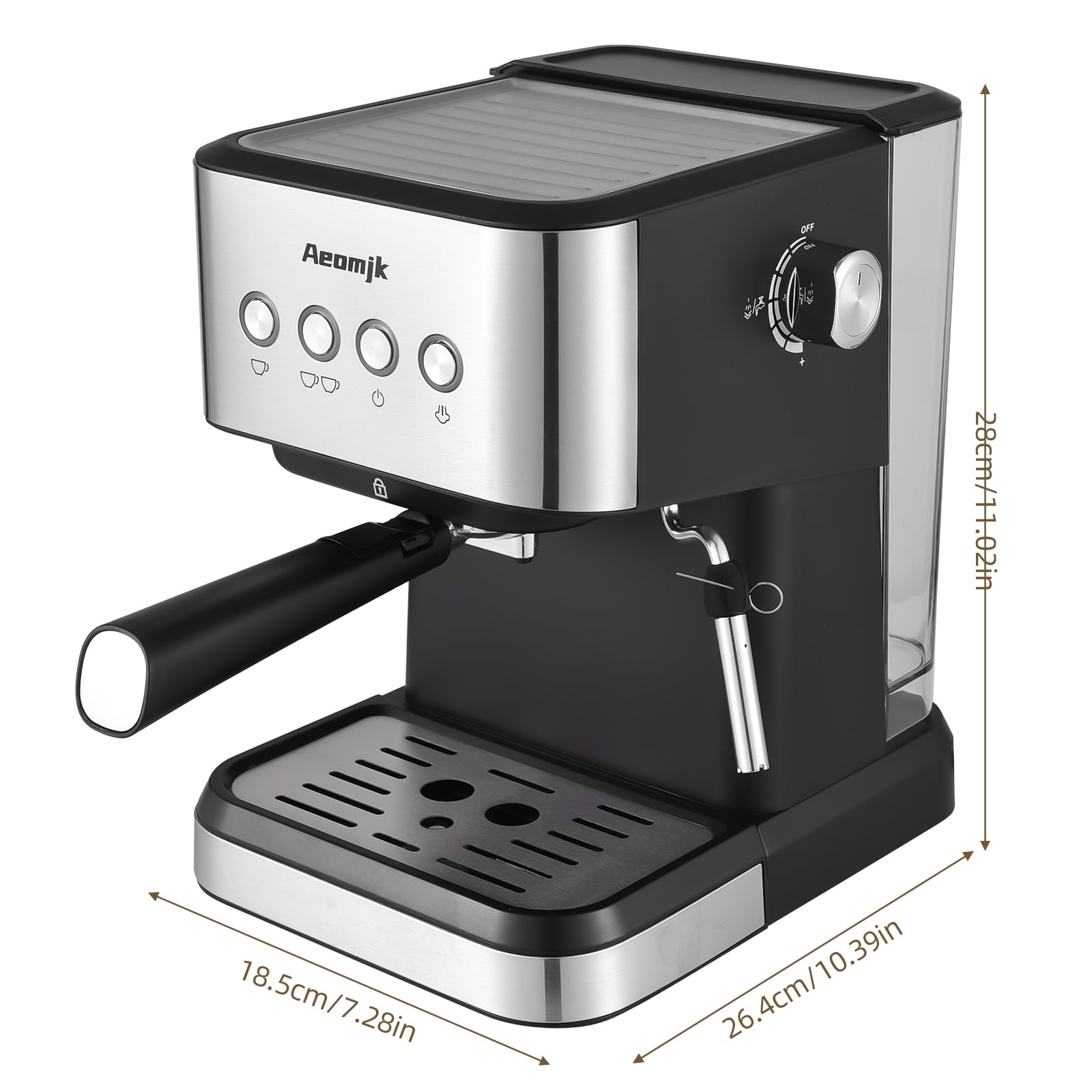 Aeomjk 15 Bar Espresso Machine 1050W All-In-One Semi-Automatic Coffee Machine with Milk Frother Steam Wand / 1.5L Water Tank / Coffee Portafilter / Portafilter Basket / Tamper Spoon for Cappuccino / Latte Our coffee machines for home comes with everything you need to start brewing right away. package includes 1 coffee machine, 1 coffee portafilter, 1 single cup portafilter basket, 1 double cup portafilter basket, and 1 coffee tamper spoon. Everything you need to enjoy a professional-grade coffee experience at home. Designed for home use, this small yet powerful espresso machine with milk frother fits seamlessly into any kitchen countertop. Its compact size and sleek design make it a perfect addition to your morning routine. Get your favorite coffee fix with ease. With NTC intelligent temperature control system, this coffee maker ensures optimal brewing temperatures for perfect extraction. fast heating system heats in just 30-45 seconds, saving you time and energy. 1.5L capacity is ideal for both single cups and larger servings. This espresso machine is not just for making delicious espresso shots. It also features a milk frother, allowing you to create creamy cappuccinos and lattes at home. Enjoy barista-quality drinks without leaving comfort of your kitchen. coffee machine is equipped with a powerful 1050W motor, allowing for quick and efficient extraction of rich, flavorful espresso. 15-bar high pressure system ensures a professional-grade brew every time.
