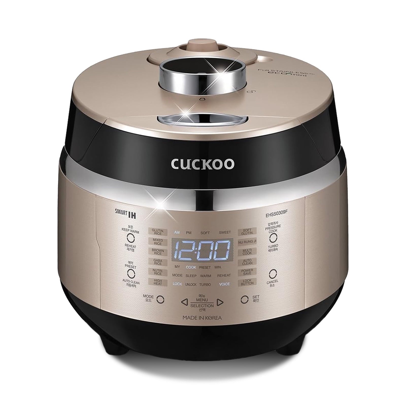 Cuckoo 3 Cup Dry Induction Heating Pressure Rice Cooker with Micom Logic Tech, Nonstick Pot, Warmer, 16 Menu Modes and Voice Guide in Gold (CRP-EHSS0309FG)