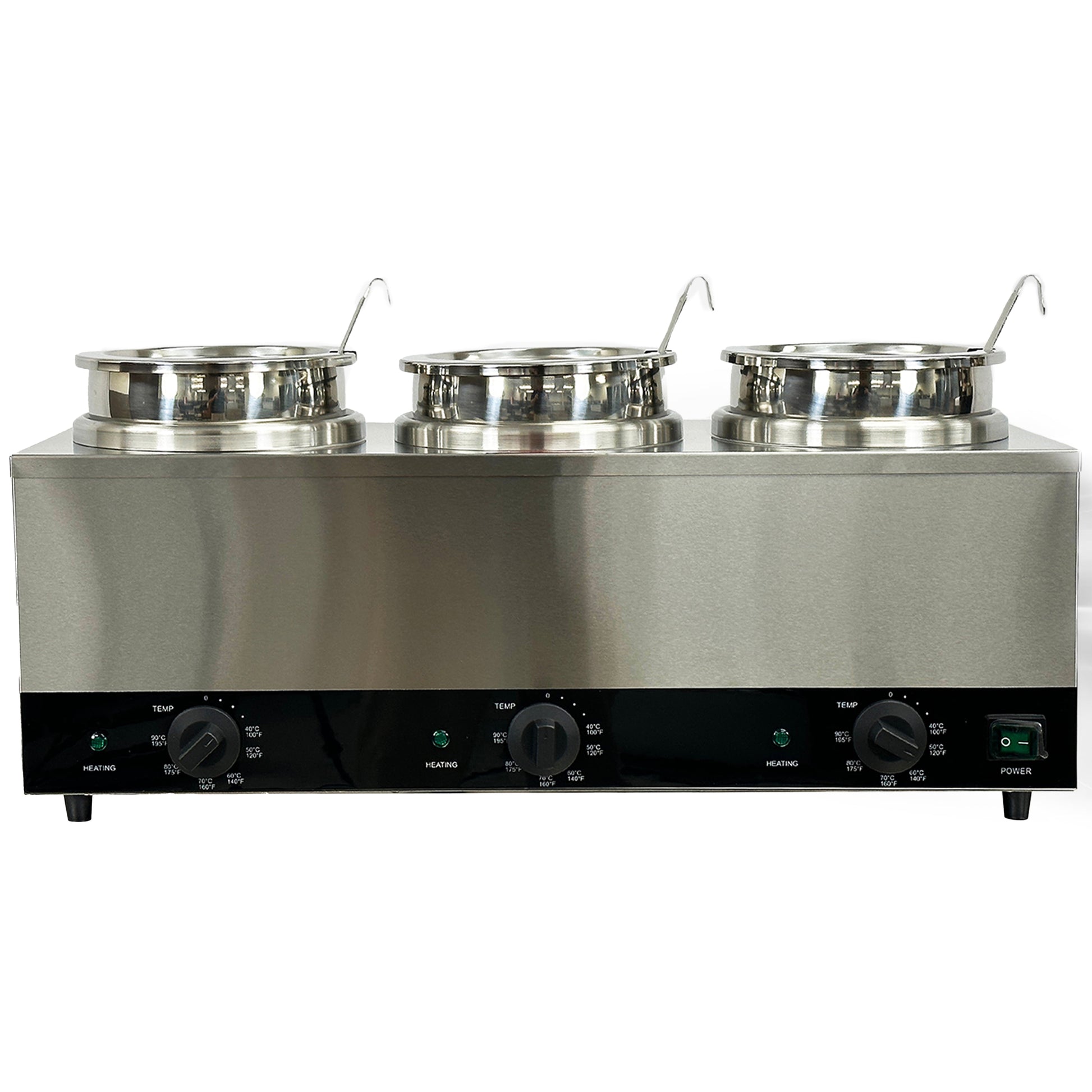 - 【Fast Heating】Our steam table food warmer is made of a powerful 304 stainless steel heating tube that rapidly warms up your food to maintain its heat. You can adjust the temperature output to suit your preference as a temperature controller ranging from 86 to 195 degrees Fahrenheit.【21L Large Capacity】Elite Kitchen Supply stainless Steel Bain Marie features a large capacity pan equipped with three 7.4Qt round pots about 8.7" deep for each one with compartments & lid included so you could change your menu from soup to all kinds of dishes as you like.【Considerable Security Design】This electric soup warmer is designed to optimize energy usage by automatically shutting off when food reaches the set temperature and the dry burning protection prevents overheating and tube damage; the non-slip rubber feet also guarantee stability as well.【Safe to Use】Built of electric commercial food warmer with perfect cleanups and maintenance. The food pan ensures added durability and peace of mind, while the thickened wall provides sturdiness and has a secure water seal.【Versatile Use】Our tabletop soup warmer is Widely used for restaurants, buffets, cafeterias, and parties; it keeps your soup, sauce, cheese, and stew at the perfect temperature. Its human-centric design guarantees convenience while meeting your daily and commercial needs, backed by a one-year warranty.