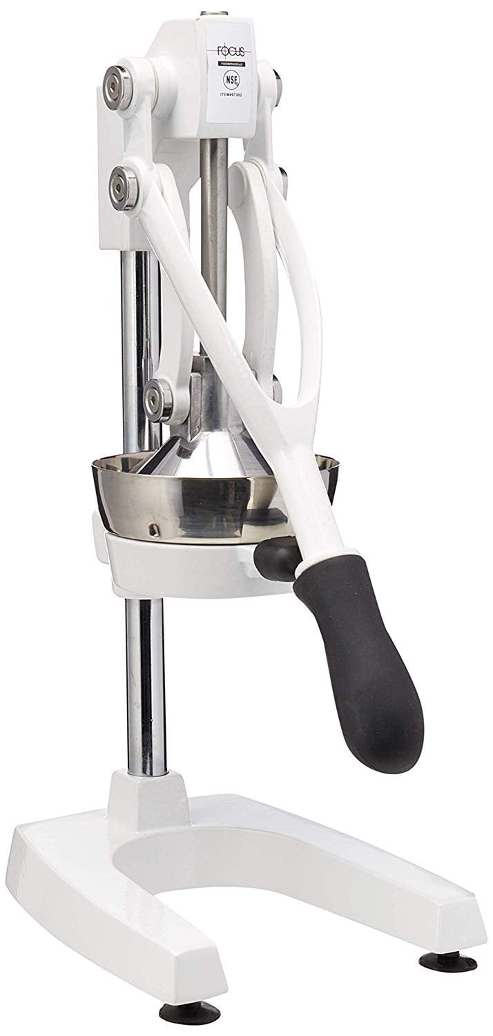 Focus Foodservice LLC is committed to providing the foodservice industry with products and services that provide exceptional value and create operational efficiency. Our team of foodservice professionals works to provide solutions in the foodservice industry. Focus Foodservice line of commercial juice presses are the finest in the market. Nothing tastes like fresh squeezed juice. Whether it is a glass of orange juice or lime juice for a refreshing margarita, Focus juice presses produce the sweetest juice possible-free of bitter skin oils. There are no worries about durability, as these units were designed to withstand the rigors of commercial foodservice operations. The Olympus extra large commercial juice press is constructed from ultra-strong and durable cast iron. The base measurement is 9.25-Inch by 7.38-Inch and it measures 31-Inch high with the handle in the upright position. The highly efficient 3 pinion design exerts maximum pressure with minimal effort. The large opening between base legs allow for larger containers to be used for juice collection for a more efficient operation. The wide base design is for greater stability and the 18-8 stainless steel perforated strainer cone and funnel cup remove for easy cleaning. The rubberized handle stop provides for a quiet operation. The white enamel finish on this juice press resists citrus acids, pitting, and corrosion while the sure-grip rubber handles are ergonomic, easy to hold and use. Finally, the Rubber suction cup feet provide for a safe operation.