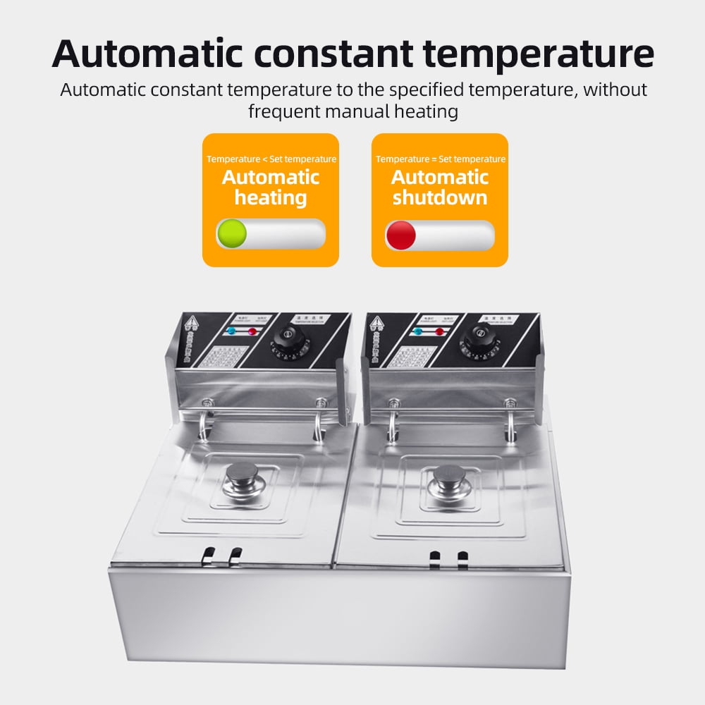 6L+6L Dual Tank Electric Deep Fryer with Removable Oil Filtration Basket and Lid 2*1.7KW Stainless Steel Automatic Thermostatic Fish Fryer Deep Fryer Pot Dishwasher Safe for Commercial Home Use Premium MaterialStainless steel refined deep fryer, high-quality snowflake sand material polishing surface, drop resistance and not easy to deform. Thickened food-grade stainless steel oil pot, split nickel-plated frying basket, high hardness and high temperature-resistant.