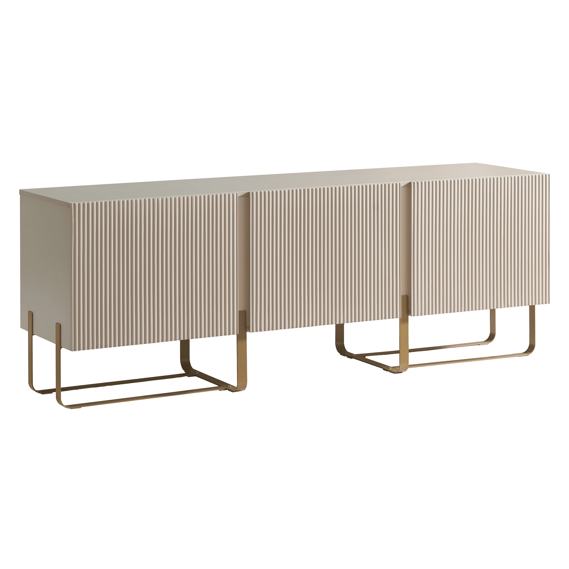 Designed to accommodate your television and media components, this TV stand offers a sleek and contemporary solution for organizing your entertainment essentials. Its low-profile design ensures that it doesn't overpower the room, making it an excellent choice for smaller spaces or those seeking a minimalist aesthetic. The sleek metal construction not only adds a modern touch but also ensures that your entertainment center remains secure and reliable for years to come. The TV stand features three spacious cabinets, providing ample storage space for your media accessories, gaming consoles, DVDs, and other entertainment essentials. The combination of gold metal base, and sleek design make this TV stand a versatile piece that seamlessly integrates into various interior styles, including modern, contemporary, industrial, and even Scandinavian aesthetics. Whether you place it in your living room, bedroom, or entertainment room, it will become an eye-catching centerpiece that enhances the overall ambiance of the space.