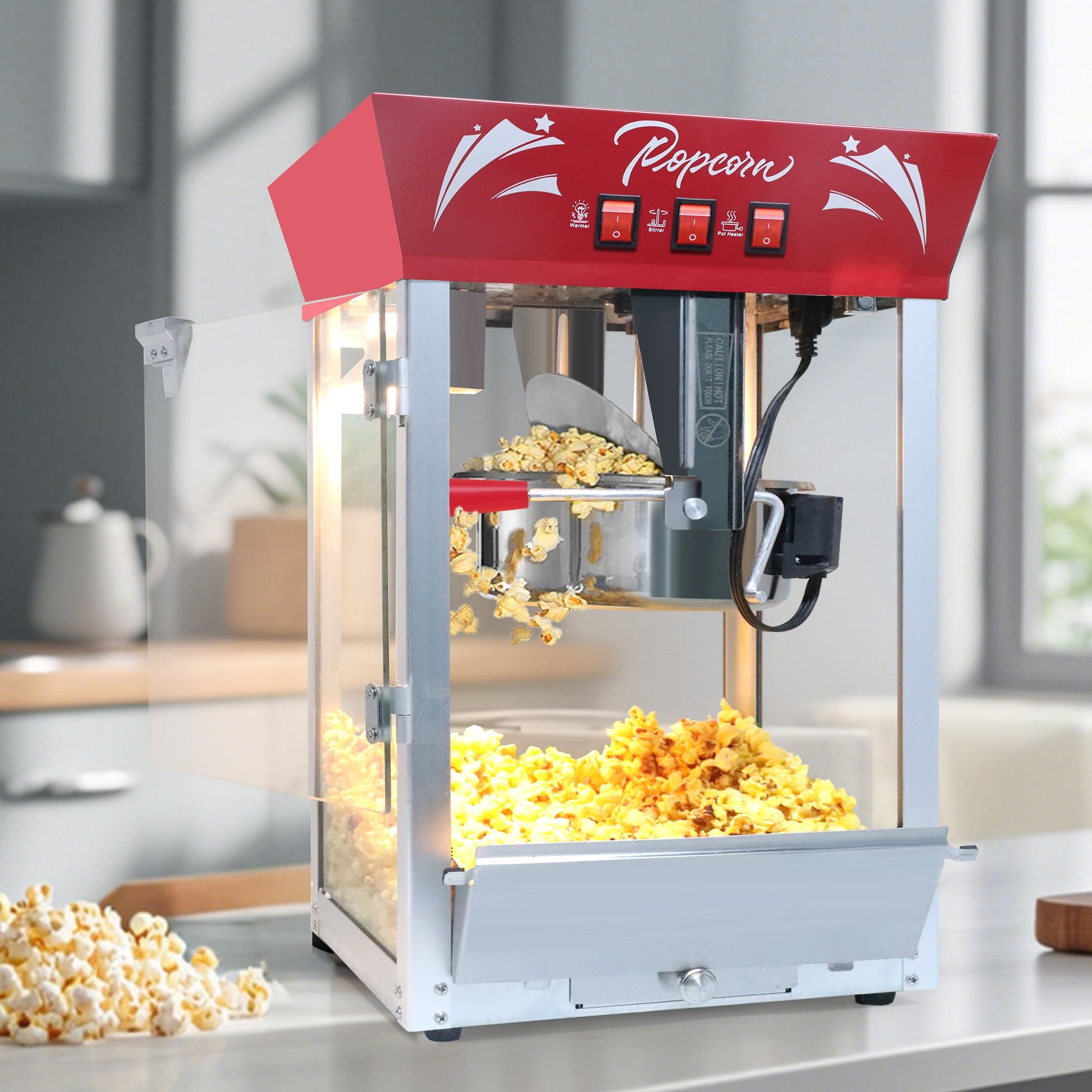 - Easy-to-use: A simple, 3-switch design makes popping fast and simple. The switches operate the heat light warmer, stirrer, and kettle heater. The built-in warming deck and interior heat light are just like professional-grade popcorn machines, keeping popcorn warm and fresh. A reject kernel tray is also included for any unpopped kernels (old maid's), ensuring every batch is served up perfectly.