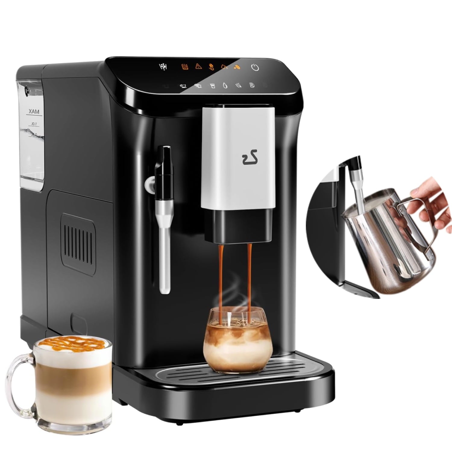 - 1.5 L Water Tank: Brew multiple cups without the hassle of frequent refills thanks to the extra-large, removable 1.5-liter water tank. The adjustable coffee spout accommodates taller cups, while the automatic cleaning function enhances convenience for everyday use.