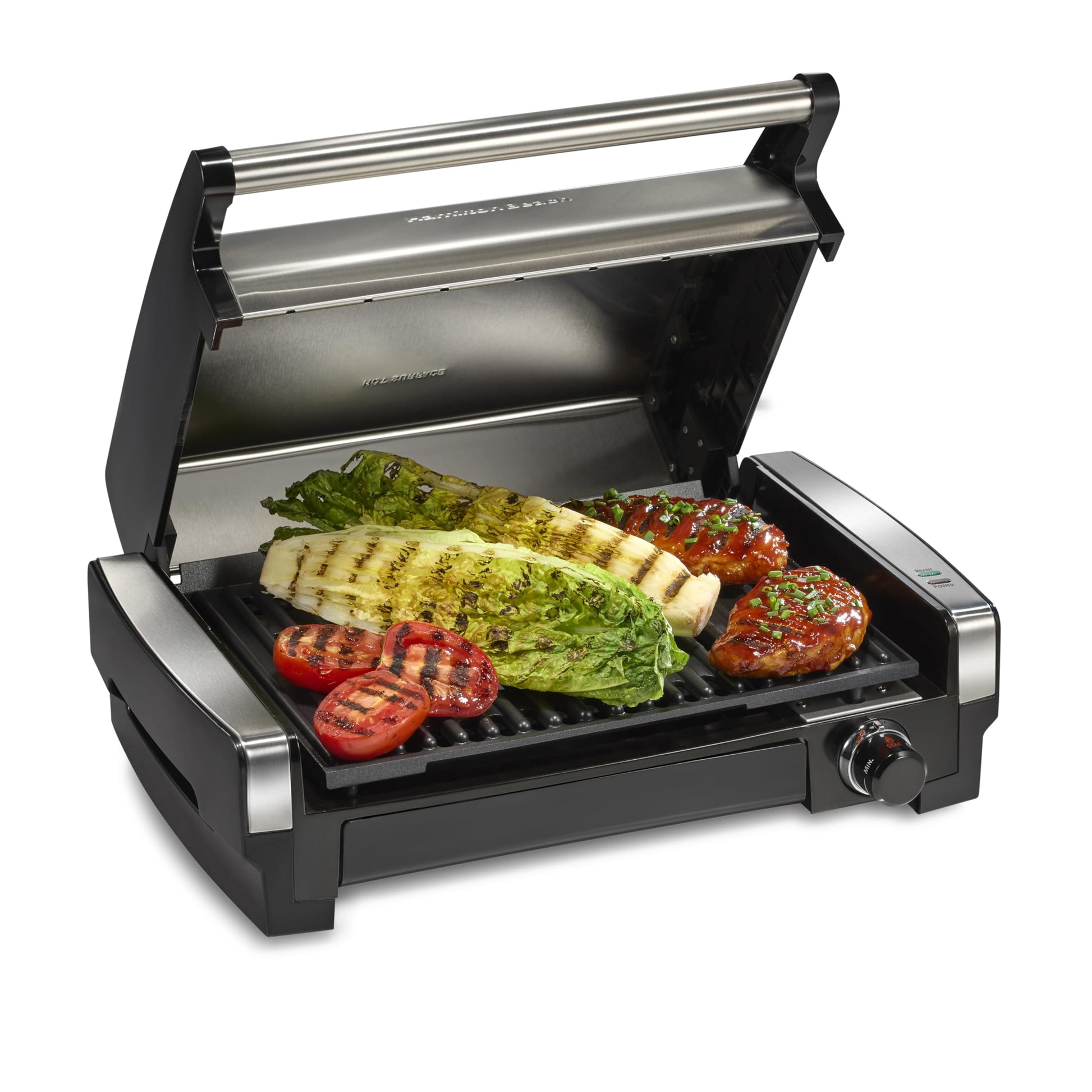Hamilton Beach Electric Indoor Searing Grill with Adjustable Temperature Control to 450F, 118 sq. in. Surface Serves 6, PFAS-Free Removable Nonstick Grate, Stainless Steel (25360)
