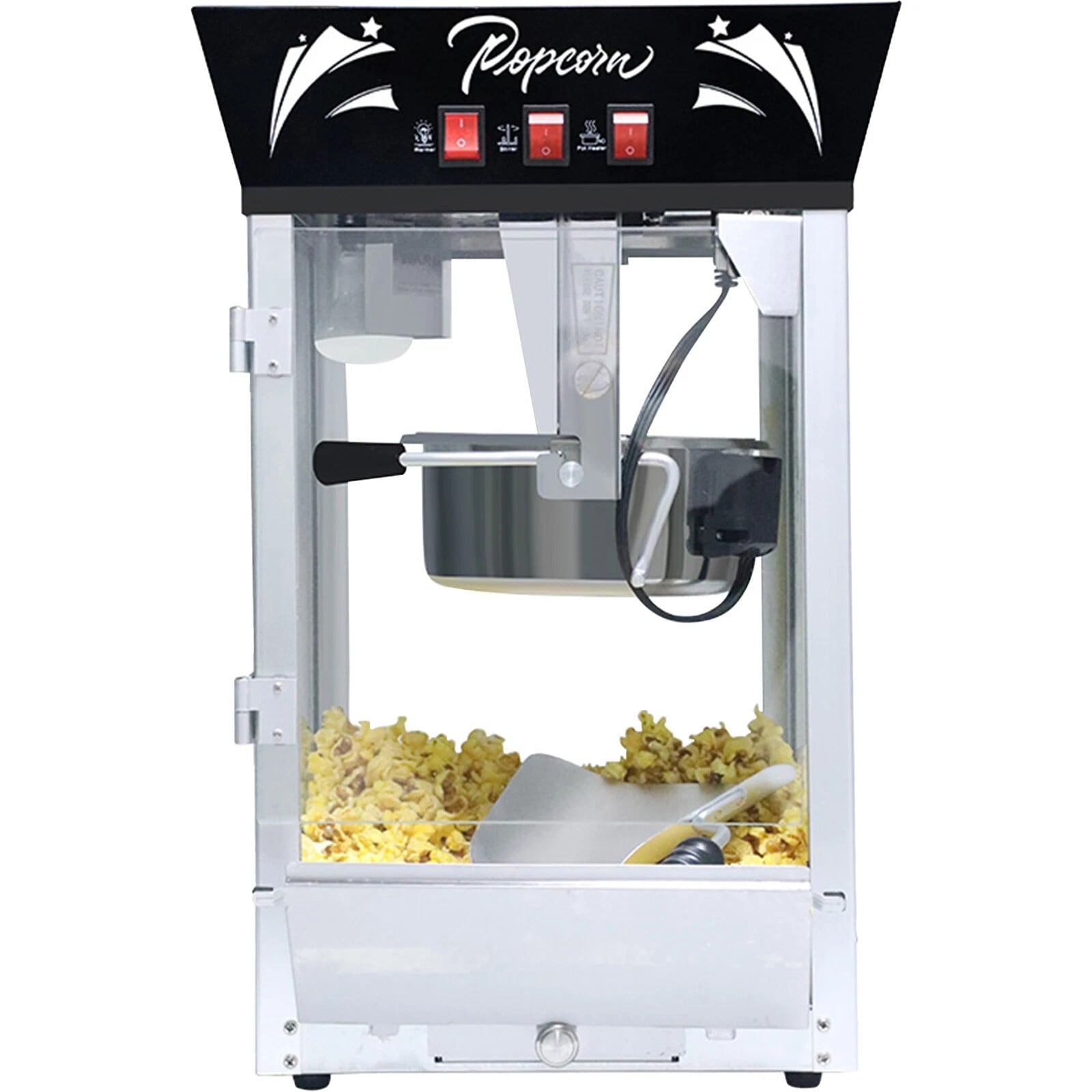 - 【Powerful Heating, High Yield】This commercial popcorn machine boasts 900W of power and an 12 oz kettle, popping up to 48 cups of popcorn per batch and keeping up with the demand of your busy concession stand. NOW that is a lot of popcorn. It takes only a few minutes to preheat the kettle. Then the hot popcorn will flow as quickly as your customers can eat it up. Get ready to keep sports fans, festival-goers, and party guests content with plenty of popcorn to go around.【Simple Operation, Lasting Warm】3 fantastic switches control the whole unit: Warmer, Stirrer, and Pot Heater. Simplified control streamlines the operation, making it easy for any staff member to use.The built-in warming deck and interior heat light are just like professional-grade popcorn machines, keeping popcorn warm and fresh. A reject kernel tray is also included for any unpopped kernels (old maid's), ensuring every batch is served up perfectly.【Durable Structure, Effortless Cleaning】This commercial popcorn machine comprises a cold rolled steel frame and tempered glass panels to withstand frequent use. The doors with magnetic latch provides quick access and enhances the appearance of the popcorn inside. The printed graphics on its top may also catch some hungry stares. Besides, the wing nuts on the kettle allow you to detach its lid easily and clean its interior thoroughly. Hassle-free cleaning will extend the machine's service life.【Designed with Your Comfort in Mind】Every component of the popcorn machine feels like second nature! Once the warming deck begins to fill, simply open the hinged cover below, then the popcorn will be right there, ready to be scooped! The removable crumb tray serves to keep the chamber clean and free from stray kernels. Collecting and disposing of fallen kernels has never been easier!【Accessories That Rock】This tabletop popcorn maker machine includes a popcorn scoop for filling your popcorn cups, and two spoons for measuring corn and oil. You are going to have such a great time creating delicious flavors. All these parts are made of food-grade materials. Complete accessories make operation a breeze right out of the box. It's time to enjoy bucket after bucket of fresh popcorn!