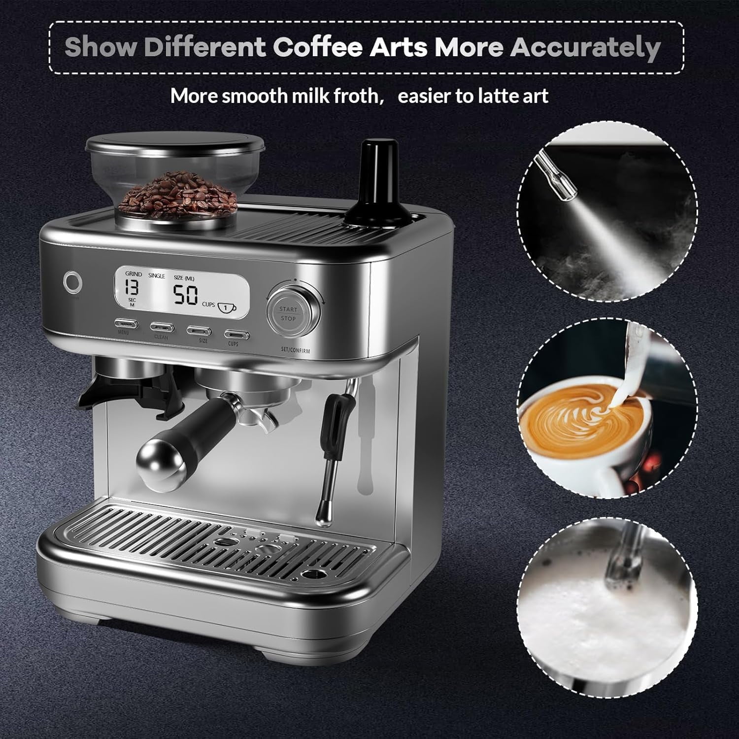 - Kojooin Machine 15 Bar, LCD Display Espresso Maker with Grinder, Milk Frother and PID Temperature Control, Professional Coffee Maker for Latte Cappuccino - 8.8 Oz Bean Hopper