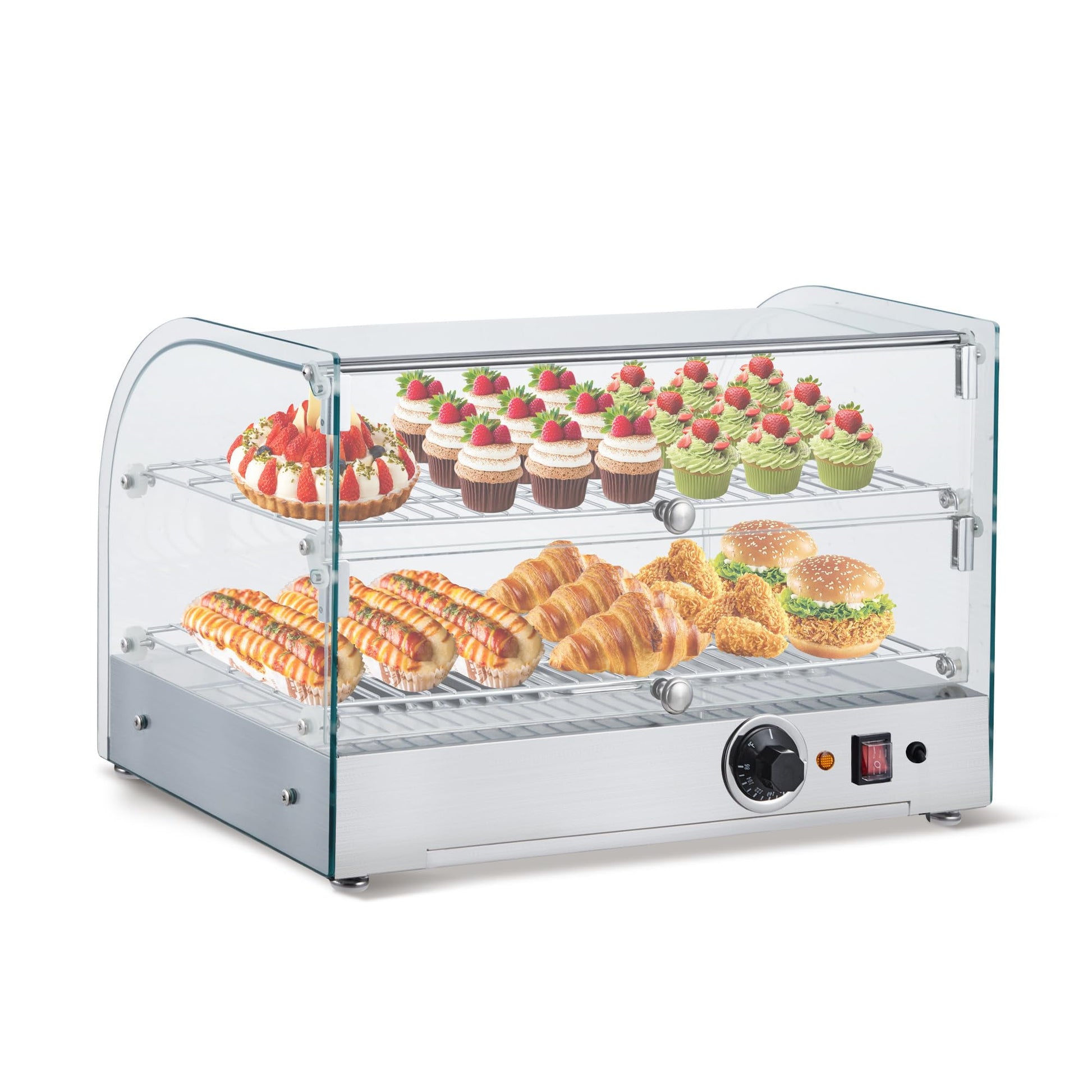 - Efficient Heating Design: The pastry display case features a unique U-shaped design for even heating and constant temperature control ranging from 85-185 ℉ (30-90 ℃), ensuring your pastries, pizzas, and pretzels are kept at the perfect serving temperature
