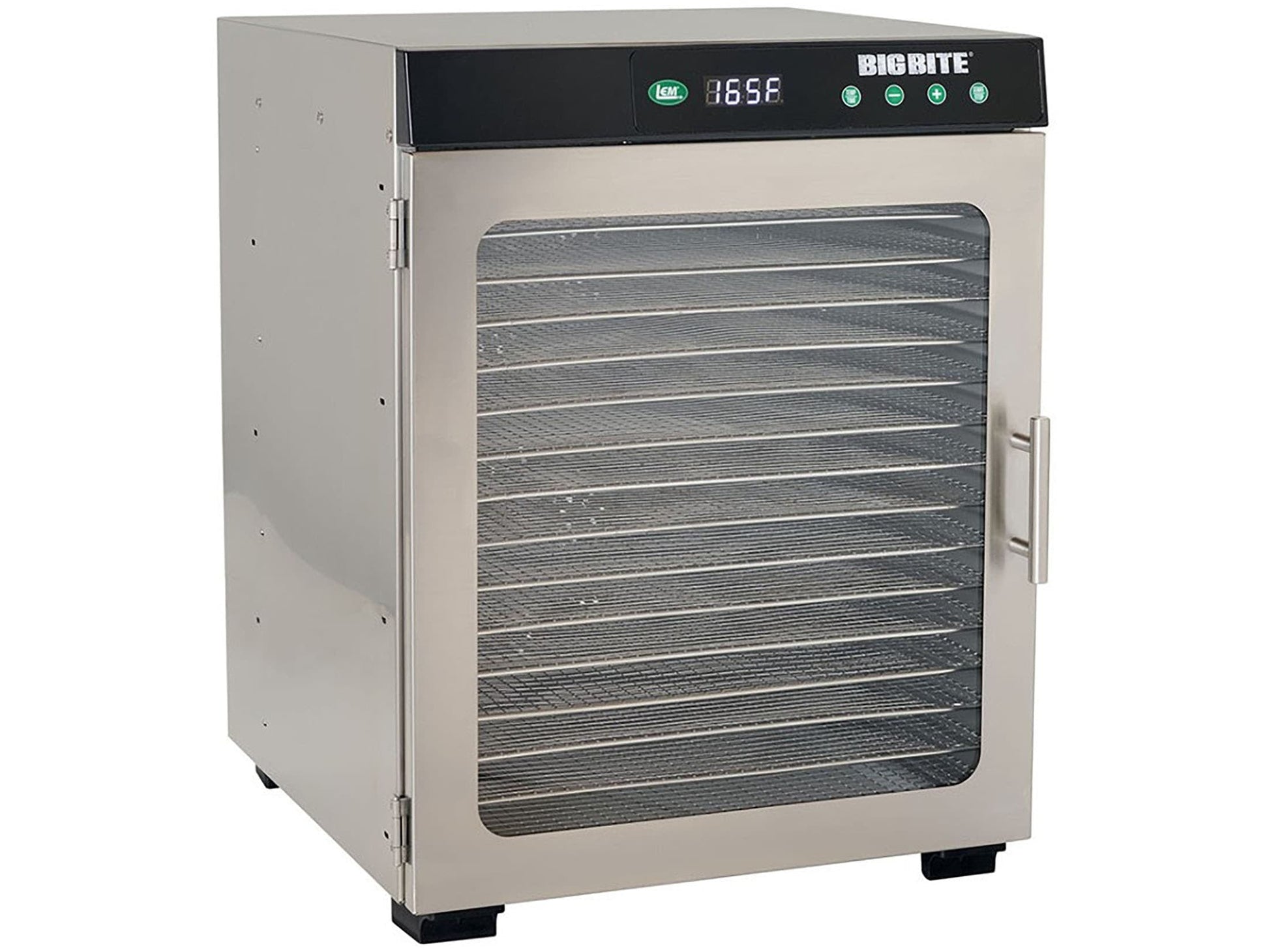 - This BigBite Dehydrator features a 1200-watt heating element; dual rear-mounted fans; and rear venting for horizontal airflow, ensuring even drying.
