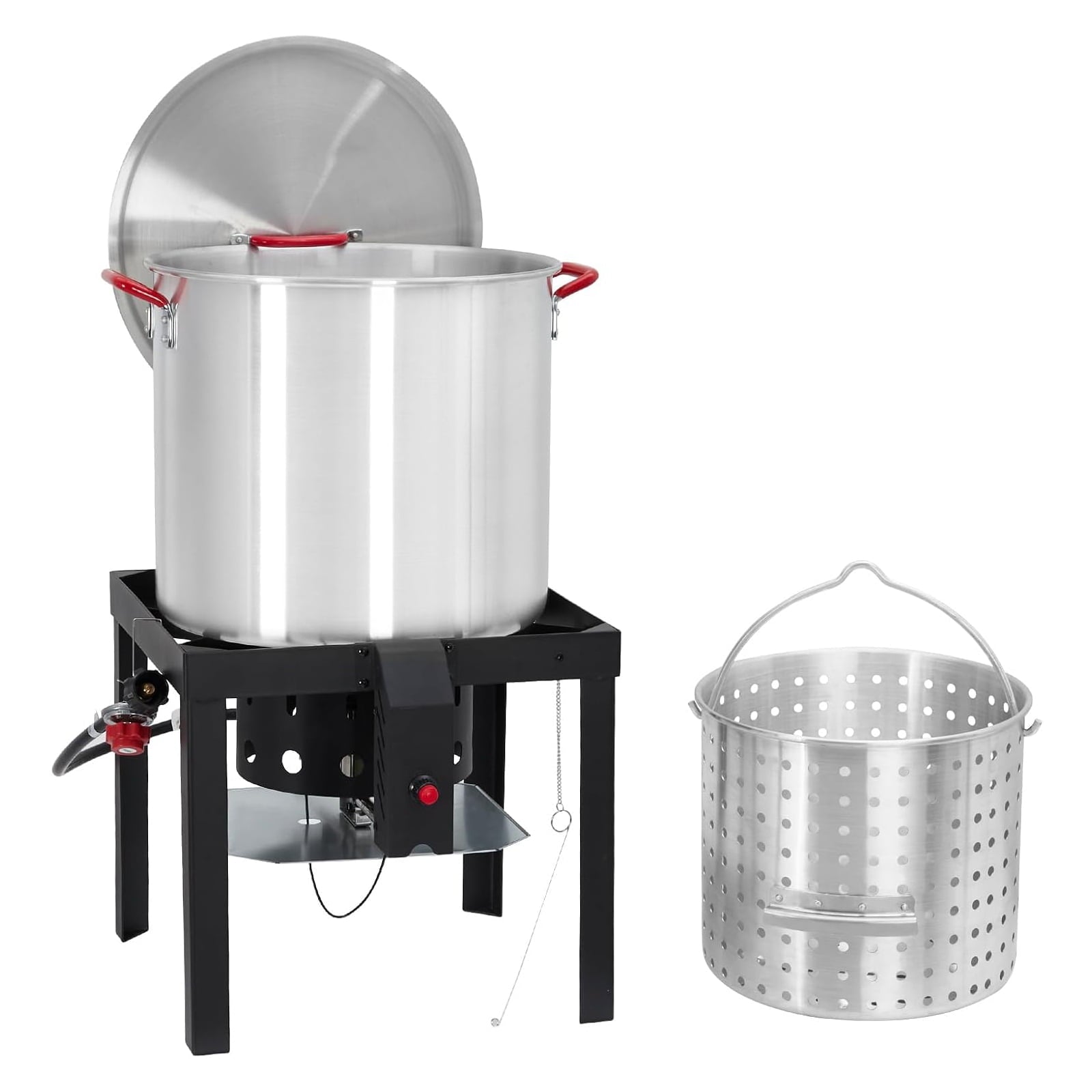 - 100 QT Large Capacity: The 100-quart seafood boil pot and steamer basket are primarily designed to fry large portions of seafood and cook shrimp. This outdoor seafood boiler crawfish pot set is also perfect for frying fish, chips, steaming tamales, chicken nuggets, and more. It's ideal for outdoor camping, and it's also great for Christmas and Thanksgiving! Its ample size makes it ideal for backyard parties, camping trips, and other outdoor activities.