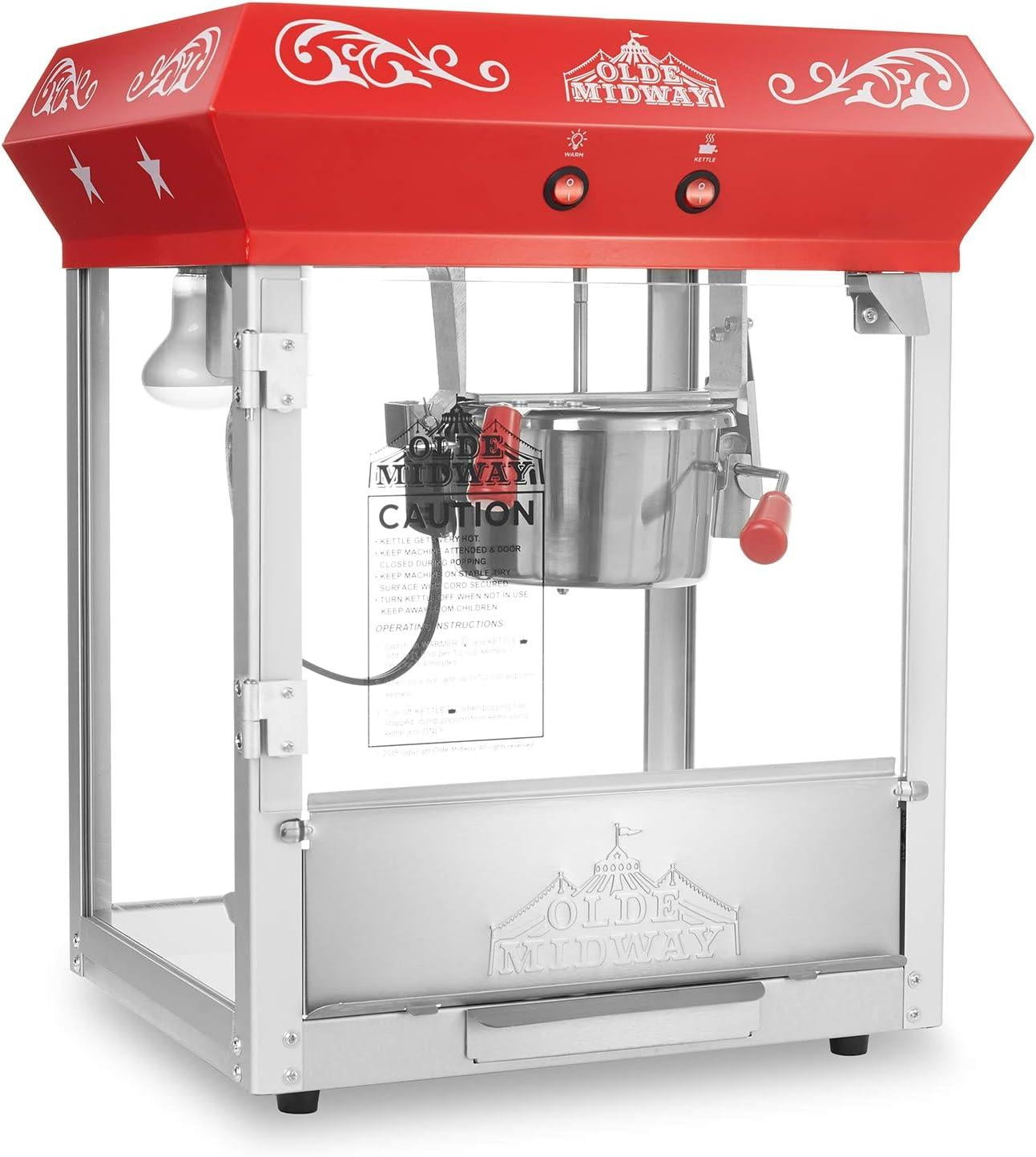 Enjoy making gourmet, movie-theatre style popcorn anywhere with the Olde Midway antique style tabletop popcorn machine. Offering nostalgic charm with a retro-style design, this counter top popcorn machine is equipped with completely modernized features for convenient, easy operation and lasting functionality. Ideal for adding novelty at school and church fundraisers and carnivals, businesses, parties, little league, and varsity games, home movie theatres, and much more, this 6-ounce kettle can produce about 2-gallons of popcorn per batch to satisfy large crowds. Makes a great gift for movie buffs. Constructed of highly durable materials including heavy-duty powder coated steel and stainless steel food zones, tempered safety glass walls, vibrant, richly pigmented premium paint, and a powerful, commercial-grade motor, this deluxe popcorn machine is built to last. Convenient 2-switch operation includes a spotlight warmer, stirrer, and pot heater. The machine includes a warming deck and heat light to keep popcorn fresh and delicious, as well as a drawer to catch any un-popped kernels for a perfect batch every time. Cleans easily with water, and runs on a US-standard 120 volt power cord for quick and easy setup almost anywhere. Includes: Olde Midway Popcorn Machine with 6 oz Kettle (50) Popcorn Bags Stainless Steel Popcorn Accessories: 1/2 cup Measuring Cup, Tablespoon, Popcorn Scoop, and Salt Shaker Minor assembly is required. Olde Midway is well-known within the industry for finely crafted, specialty appliances that combine stylish design with exceptional durability at a great value.
