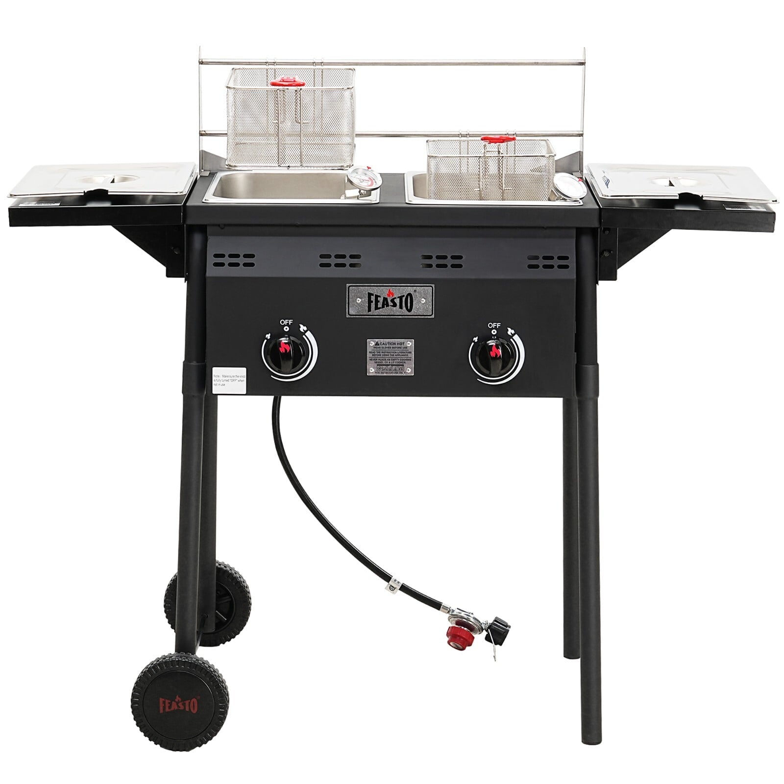 Feasto Outdoor Propane Deep Fryer,Dual Tank with Dual Independent Cast Iron Burners and Thermometers,Removable Fryer Pot,Baskets & Lids,