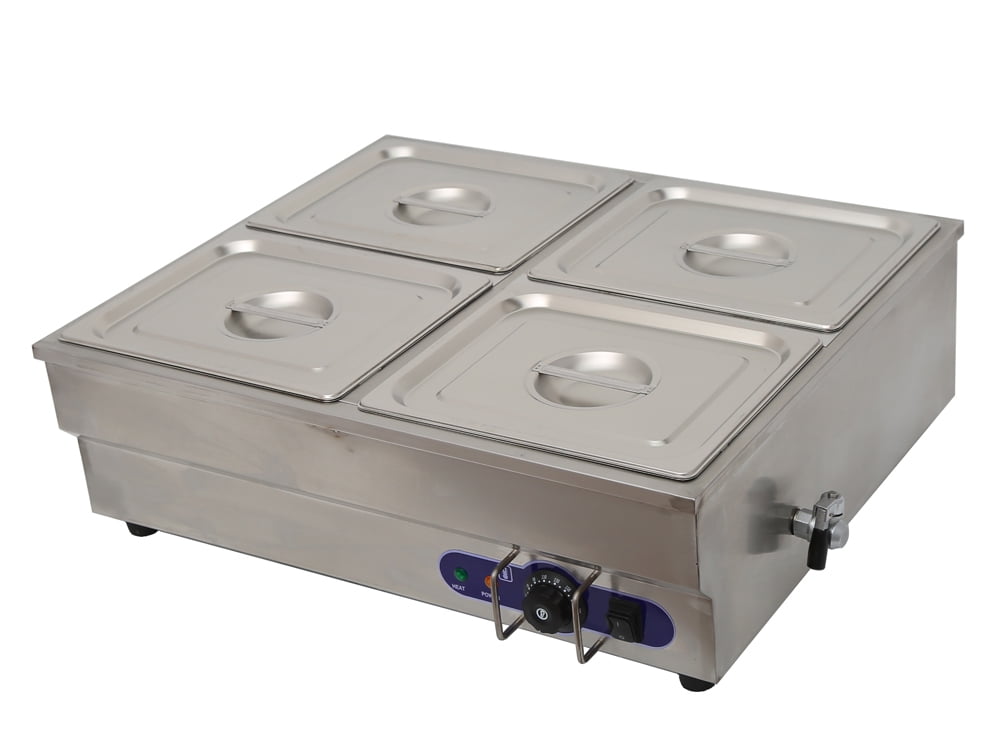 - This bain-marie is constructed with very thick high quality stainless steel. It provides high-efficiency performance and is equipped with a thermostat for easy temperature control.