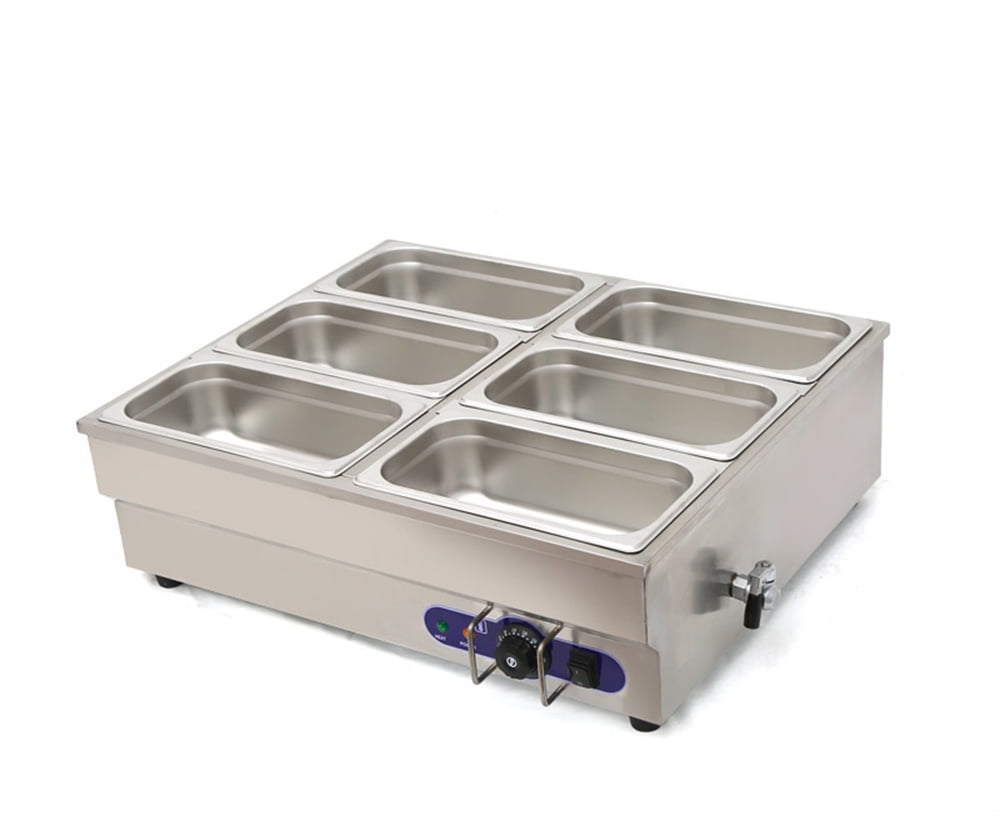 This exciting new bain-marie is constructed with very thick high quality stainless steel. It provides high-efficiency performance and is equipped with a thermostat for easy temperature control. They are extremely easy to use and very reliable. It has 6 pans and will hold six GN1/3 pans, 6" deep. In fact this buffet warmer is ideal for restaurants, hotels, banquet halls and cafeterias but will still work great around the home or for catering purposes due to the convenient 110V electrics!