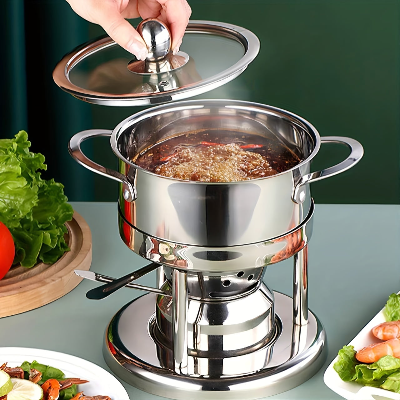 Stainless Steel Mini Hot Pot with Alcohol Burner - Single Serving, Dishwasher Safe, Perfect for Fondue & Shabu-Shabu, Indoor/Outdoor Portable Cookware