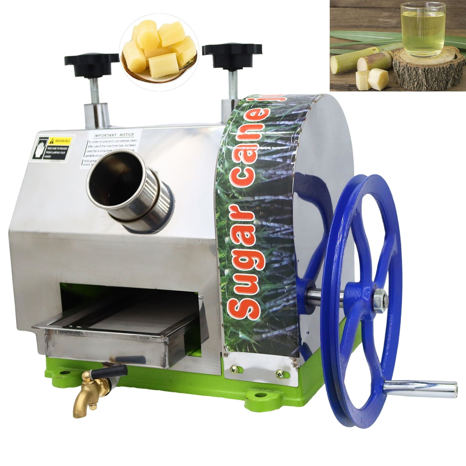 - This sugarcane press extractor adopts food grade stainless steel juice box and high quality faucet, both of them make it easy to clean, also, it's more hygienic.