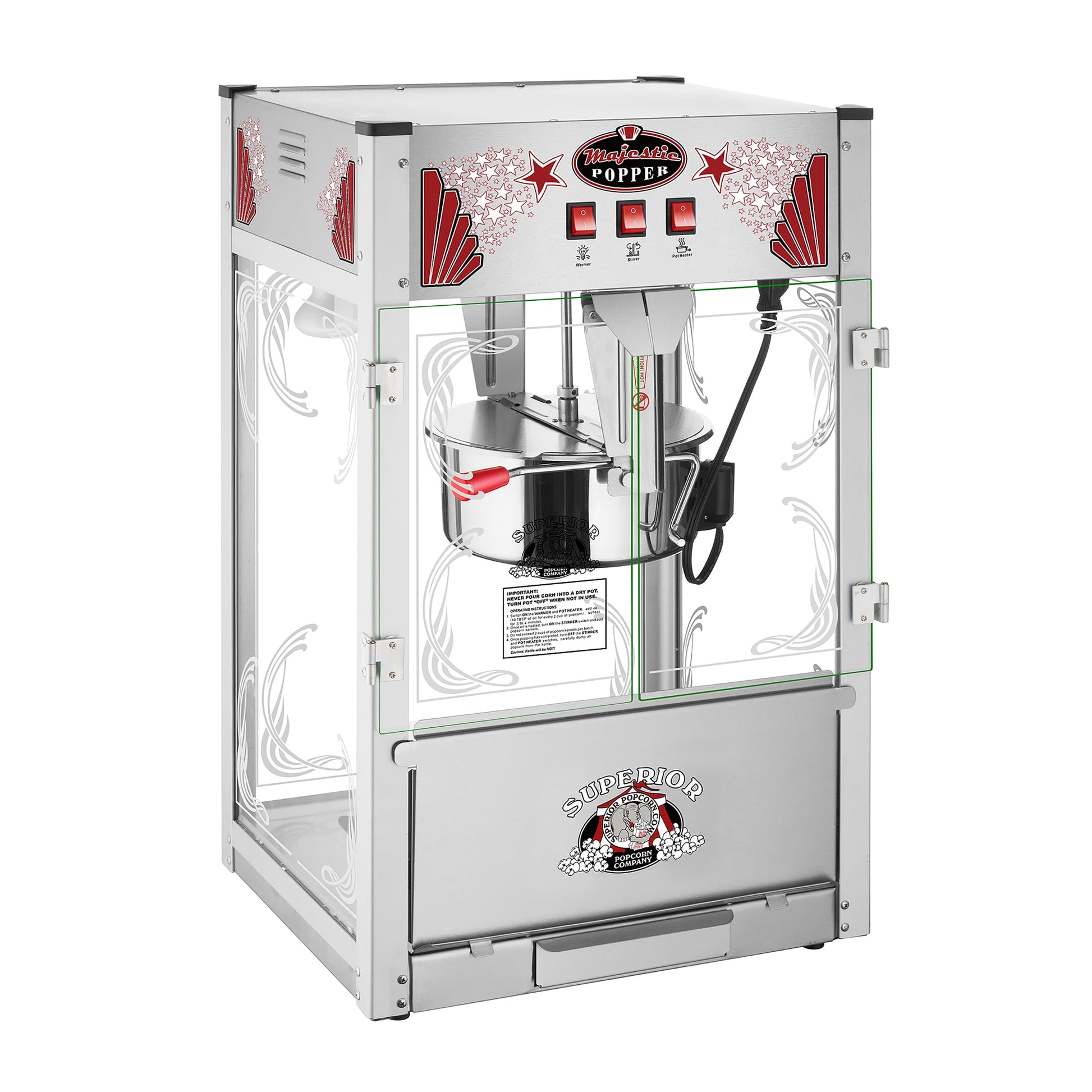 Bring movie theater style popcorn to your home or office with the Majestic Popcorn Machine by Superior Popcorn Company. The antique-style popcorn maker machine for home includes a 16-ounce stainless-steel kettle that makes about 6 gallons of popcorn in minutes, a heated warming deck to keep this delicious snack fresh, and a convenient old maids drawer that collects the reject kernels for easy clean up. The timeless vintage design of this pop corner machine is sure to be a fun addition to your movie night supplies and family parties, and it is the perfect complement for your home theater or game room accessories and décor.