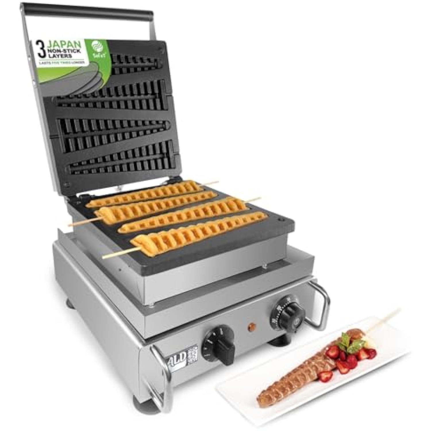 - ✪ COMMERCIAL USE: The waffle iron with mechanical operations bakes 4 stick waffles at the same time. The power consumption is 1.75 kW. Stainless steel construction is durable, strong, and requires little effort to maintain.