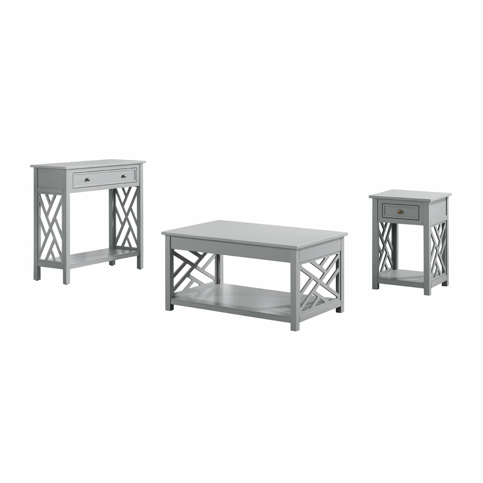 - Set includes coffee table, end table and sofa/console table with drawers