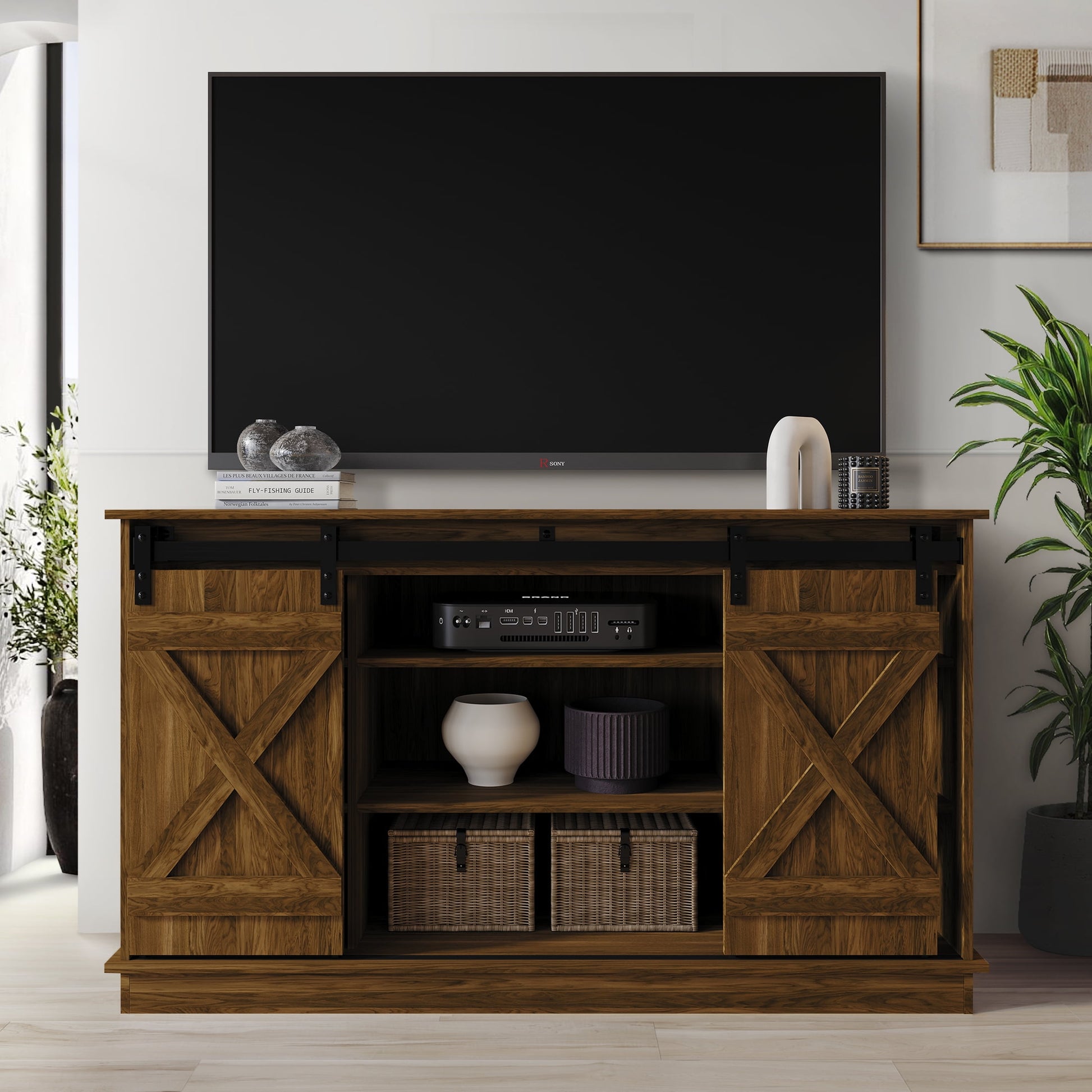 Transform your living space with our exquisitely designed Vintage TV Stand, the perfect blend of timeless charm and functional storage. Crafted from premium manufacturer wood, this stand ensures durability and longevity for years to come. Three interior shelves are thoughtfully designed to keep your media players, DVDs, and accessories organized and clutter-free, while discreet cord management maintains a polished appearance. With three additional shelves on each side, you can showcase your favorite books and decorations, adding a personal touch to your home decoration. The standout feature of this TV stand is its charming barn-style doors that effortlessly slide shut, elevating its appeal. Sleek black metal hardware accents contribute to its vintage elegance. Assembly is a breeze, making setup hassle-free for adults.